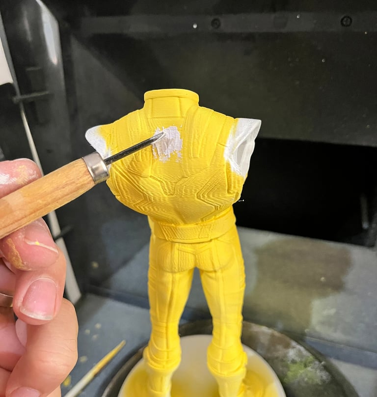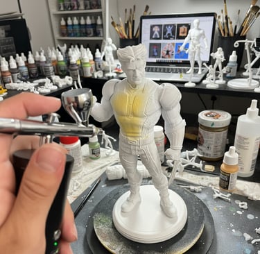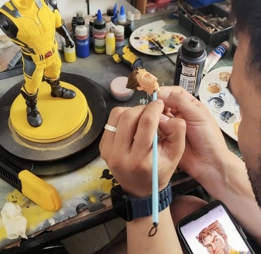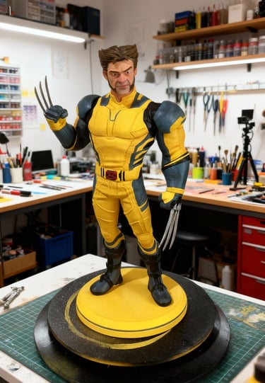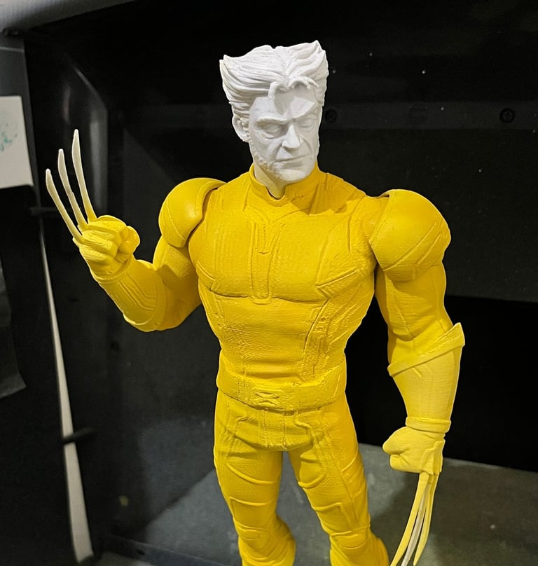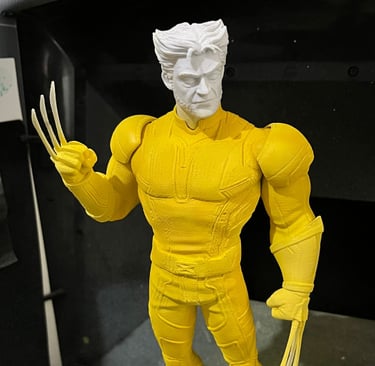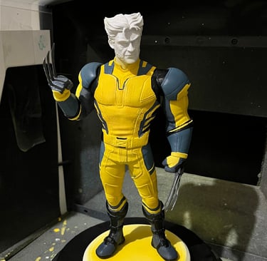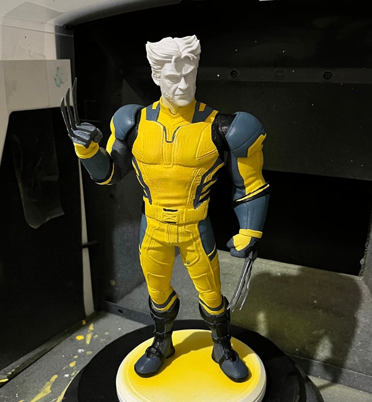 3D baskı Wolverine figürü, yüzey düzeltme ve astarlama sonrası airbrush ile ana renklerine boyandı. Maskeleme ve detaylı el boyamasıyla kostüm, pençeler ve yüz ifadeleri karaktere uygun şekilde işlendi. Çalışma, vitrinlik ve koleksiyon standartlarında bir figür olarak tamamlandı.