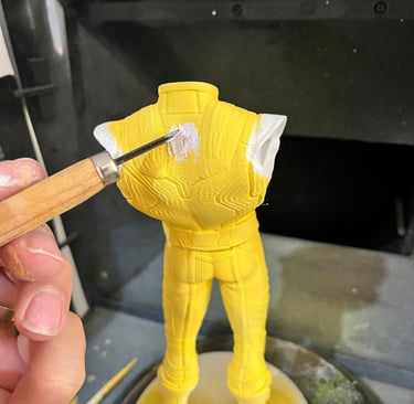 Sonraki karelerde figürün gövdesine airbrush ile sarı renk uygulanmaya başlandığını görüyoruz.
